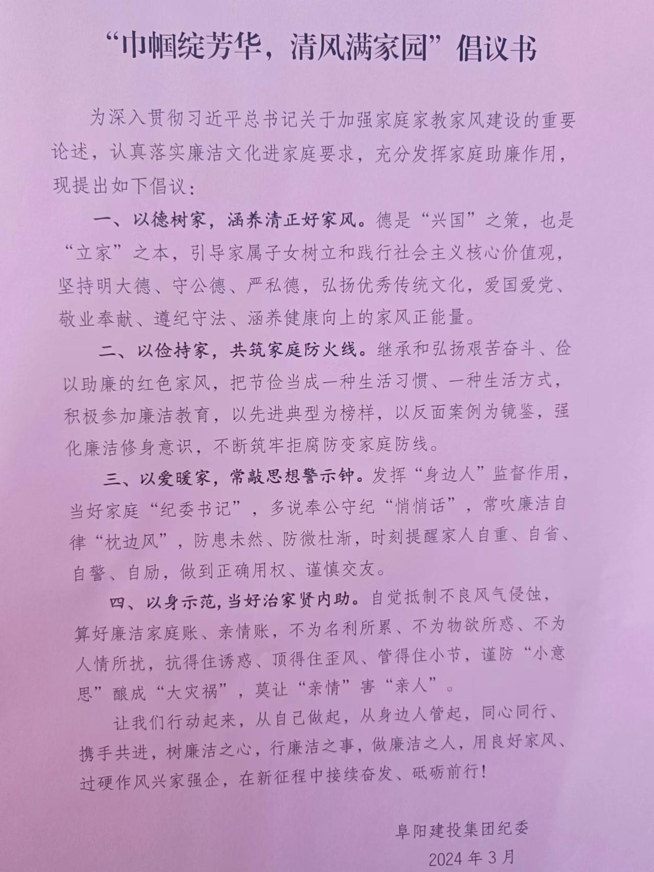為打造廉潔家風文化,讓廉潔成為建投集團員工的行為自覺,3月8日上午,阜陽建投集團召開涵養(yǎng)清廉好家風 巾幗建功新時代交流座談會。集團副書記、副總經理高婁主持會議,阜陽市紀委派駐監(jiān)察專員、集團紀委書記王慧和全體女職工參加。
